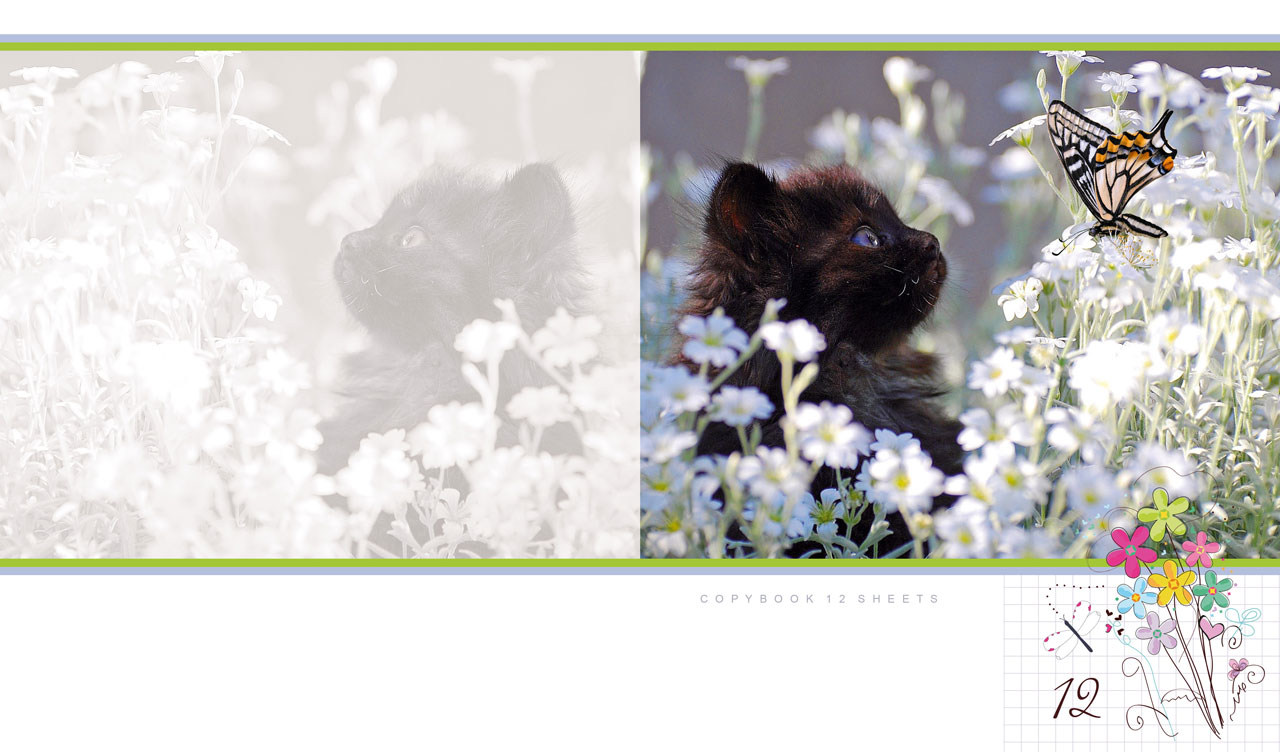 3. Black kitten and a butterfly in a garden of white flowers on a white backdrop