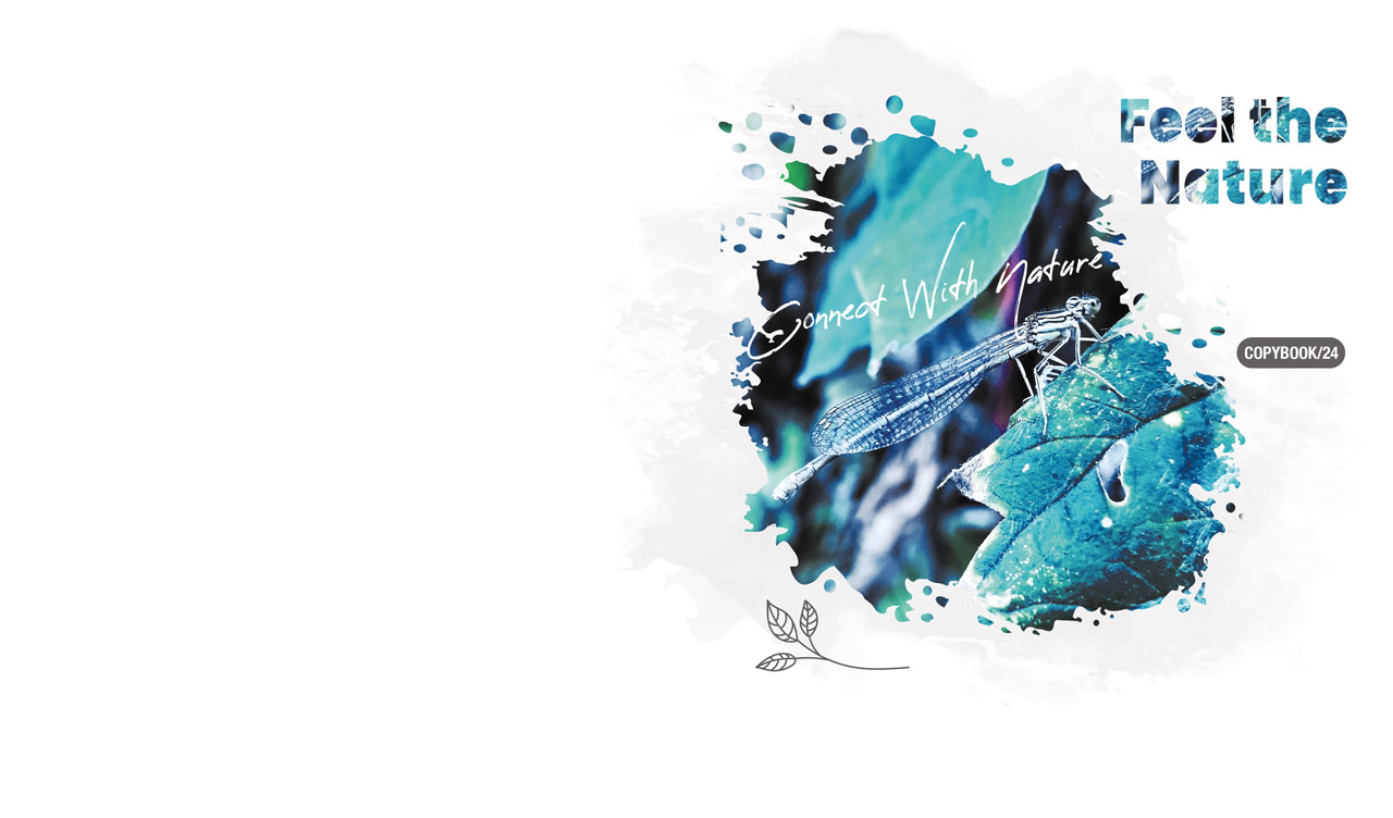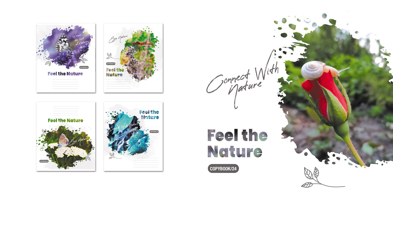 1. Marbled White on a violet hyacinth flower within an inkblot backdrop on white 2. Chalk Hill Blue on white flowers within a green inkblot backdrop on white 3. Ruddy Darter dragonfly on dry weed within yellow-green inkblot backdrop on white 4. White-legged damselfly on teal blue leaves within an inkblot backdrop on white 5. White garden snail on a red rose within a green inkblot backdrop on white
