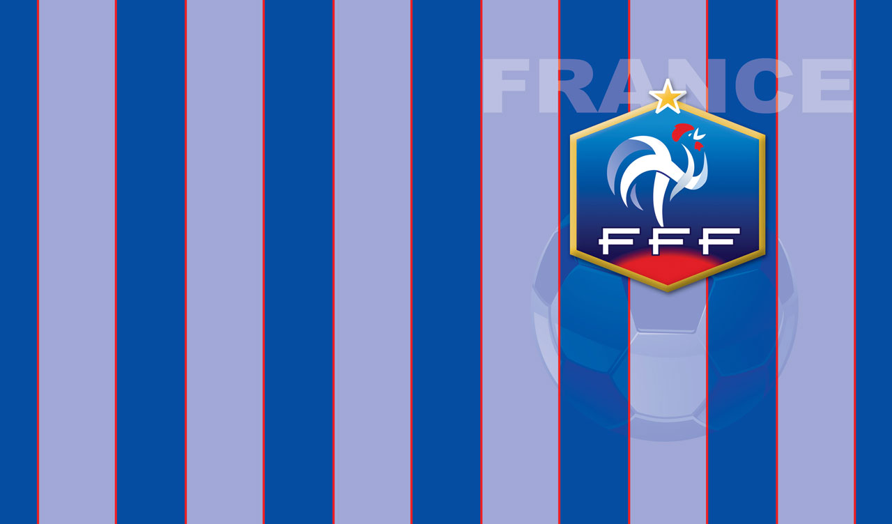 Blue, white and red French football federation logo of a rooster on blue and pastel blue seamless striped pattern background.