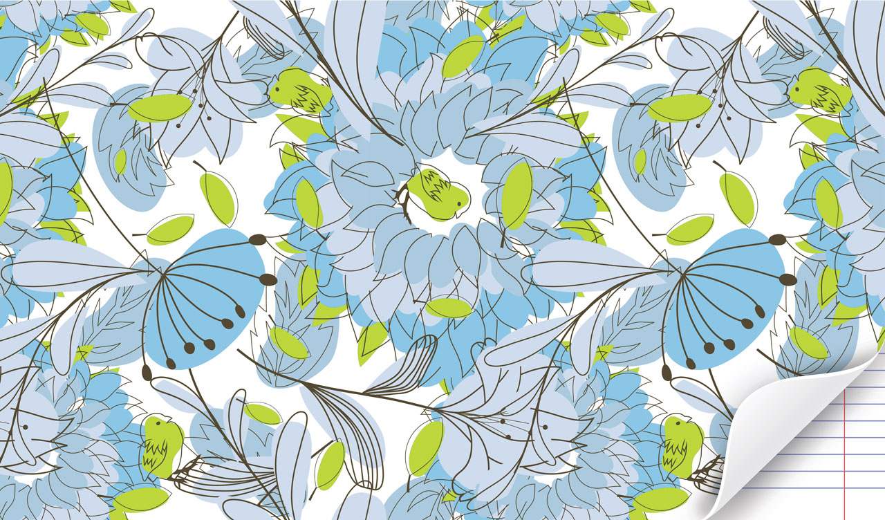 1. Seamless pattern of purple, maroon and beige flowers on a white background 2. Seamless pattern of pastel blue, green and gray flowers on a white background 3. Seamless pattern of pastel green and yellow flowers with pink birds on white 4. Seamless pattern of tan , cream and beige flowers on a white backdrop