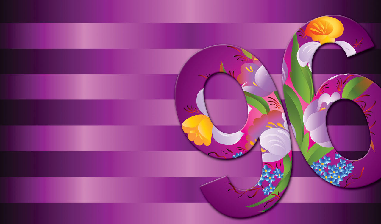 Violet, blue and orange flowers with green leaves on the number ninety six illustration against a purple striped background.