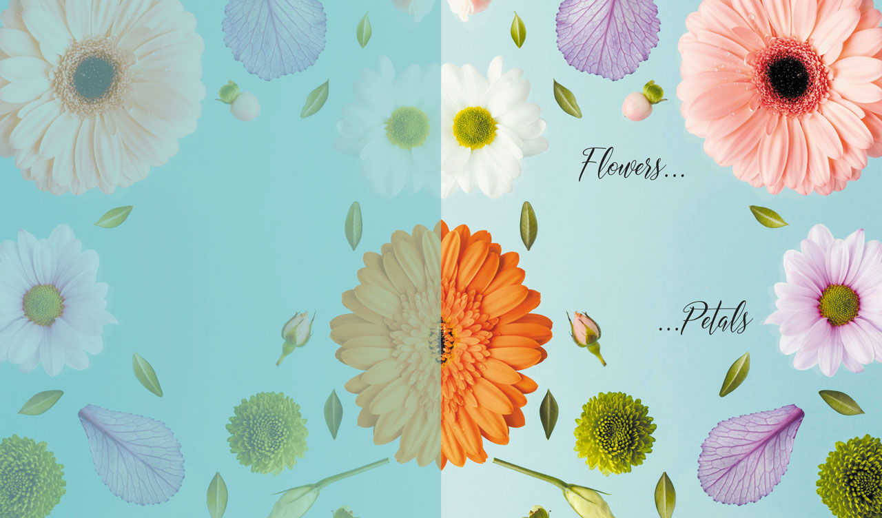 1. Assorted colorful composition of tulips on white and pastel yellow