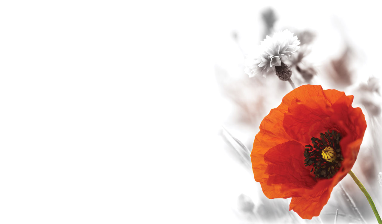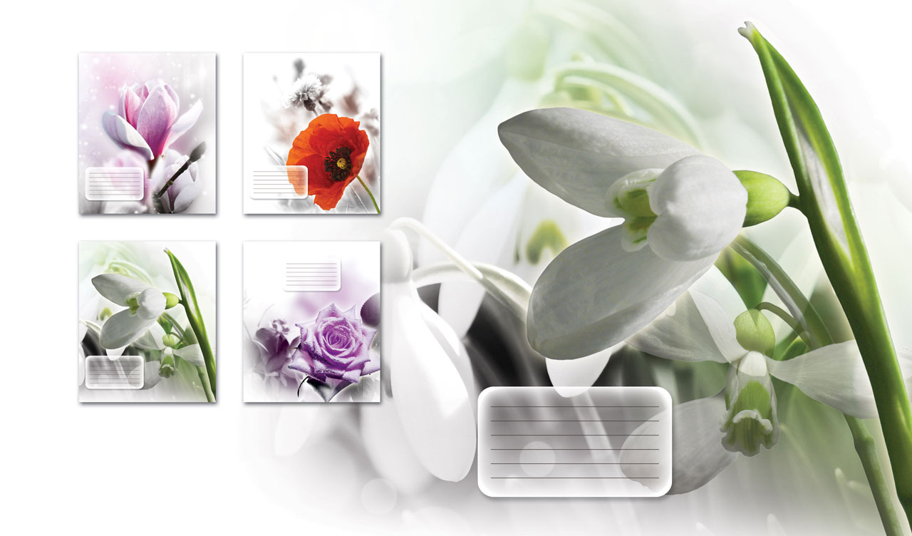 1. Red poppy close-up against a black and white carnation flower in a field 2. Violet rose close-up against a black and white bunch of flowers 3. Pastel pink magnolia close-up against the background of black and white petals 4. White snowdrops with green stems close-up against a black and white flowers