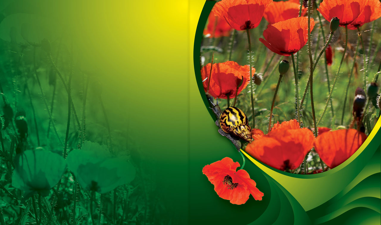 1. Yellow and black snail crawls by the red poppies in the sun on a green gradient 2. Bees on pink echinacea and green leaves on a dark purple to red gradient 3. Motley butterfly sits by the pink pyrethrums in the sun on a navy-blue gradient 4. Yellow butterfly flies by the white daises in the sun on a maroon gradient