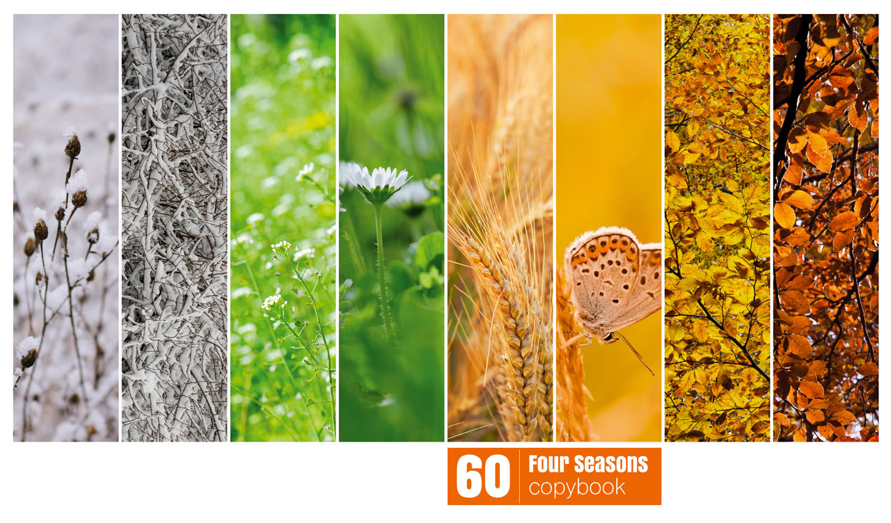 1. Four-panel collage on white snow backdrop captures the beauty of the seasons 2. Eight-panel collage on a white backdrop captures the beauty of the seasons 3. Five-panel collage captures flowers, buds and autumn leaves on green background 4. Five-panel collage captures flowers, ladybug, leaves and dew on yellow background 5. Four-panel collage on white captures the beauty of seasons on white background