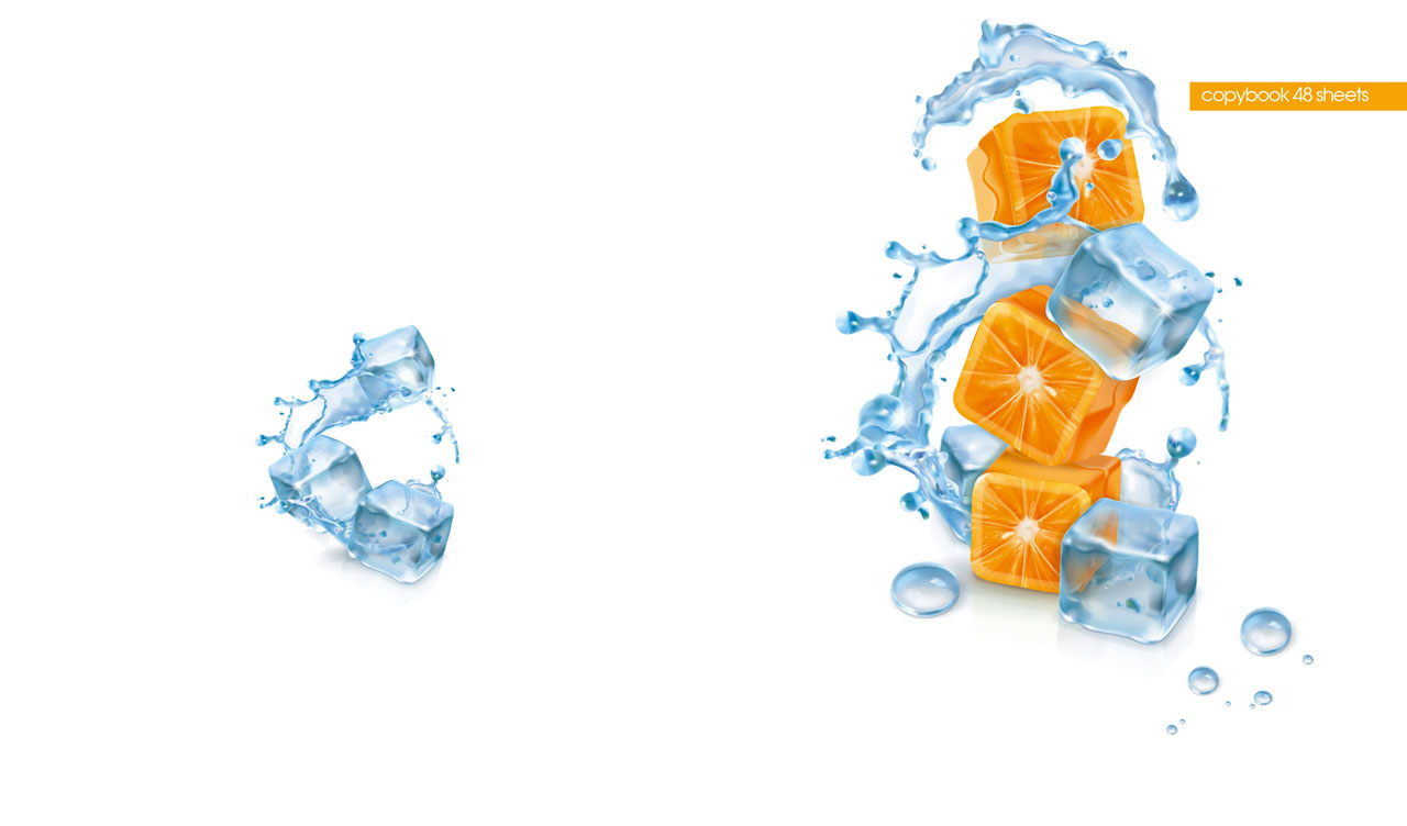 5. Cubes of ice and oranges with water splashes on a white backdrop