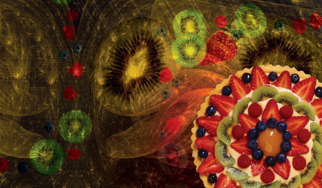 3. French fruit cake with strawberries, kiwi and blueberries on a green background
