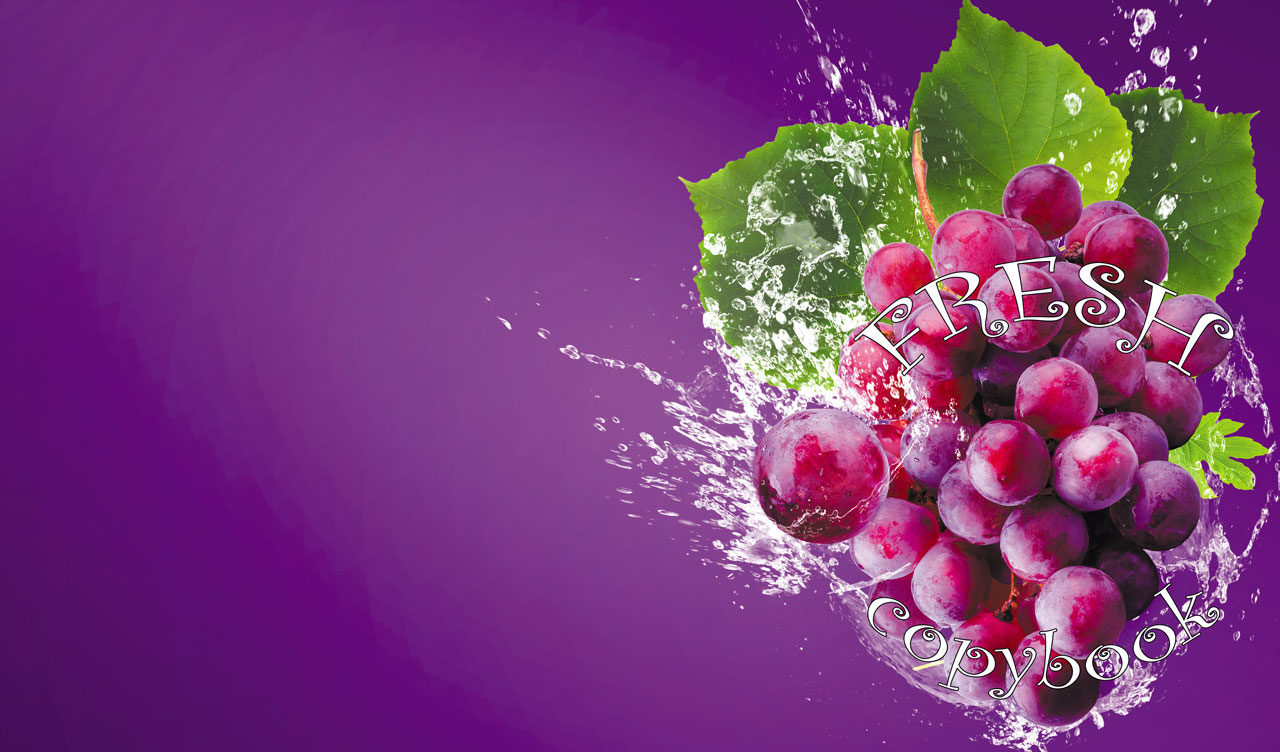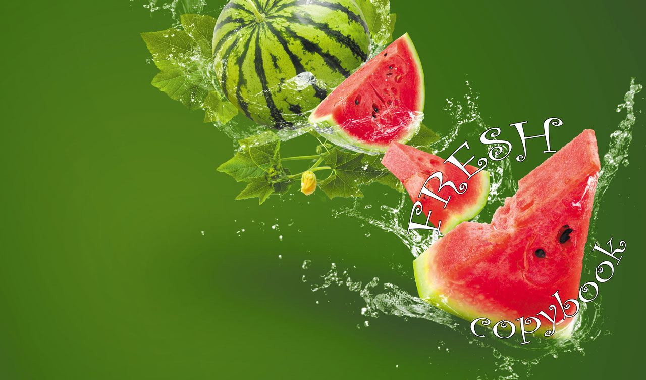 1. Fresh whole and sliced watermelons in water splashes on green 2. A pair of fresh red apples in water splashes on red 3. Fresh coconut halves in milk splashes on teal 4. A bunch of fresh red grapes in water splashes on violet 5. Slices of fresh oranges in water splashes on yellow-orange 6. Fresh whole and sliced dragon fruits in water splashes on fuchsia pink