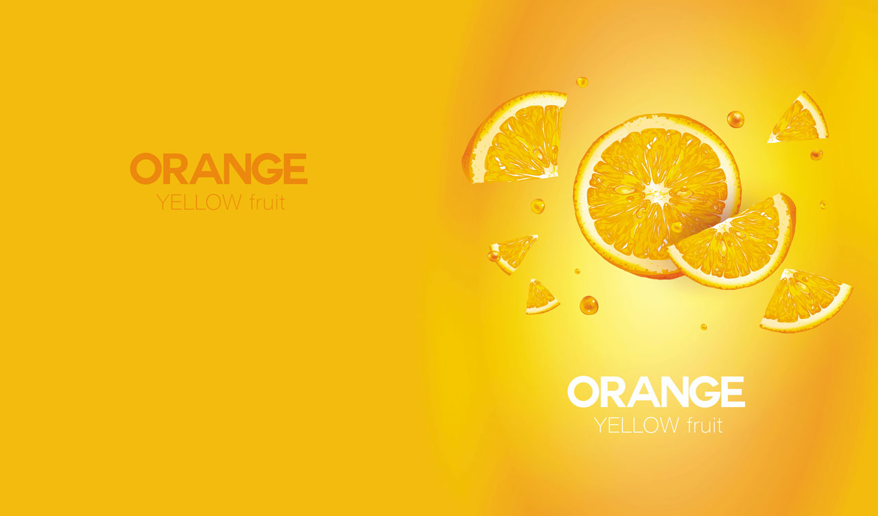 1. Vibrant orange slices and water splashes in motion on bright yellow