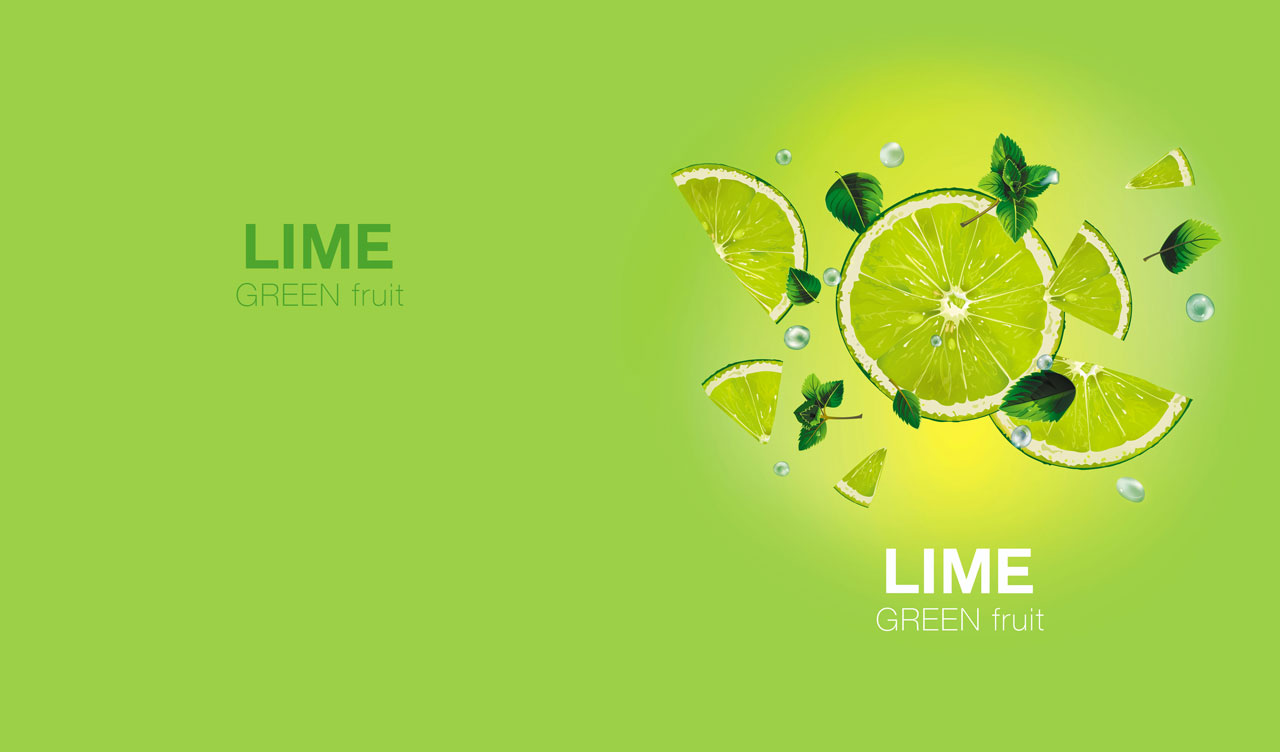 2. Lime slices with mint leaves and water splashes in motion on lime green
