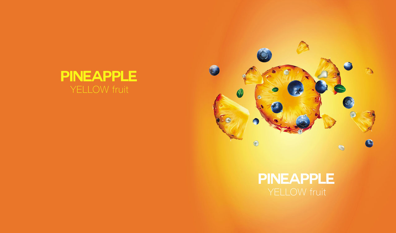 4. Sliced pineapple with blueberries and water splashes in motion on orange
