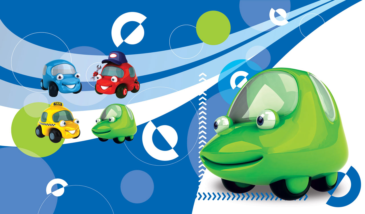 1. Red cartoon mechanic car in a blue cap on a red and white abstract background 2. Yellow cartoon taxi car on a pink and white abstract background 3. Blue cartoon cheerful car on an orange and white abstract background 4. Green cartoon car with good natured look on a blue and white abstract background