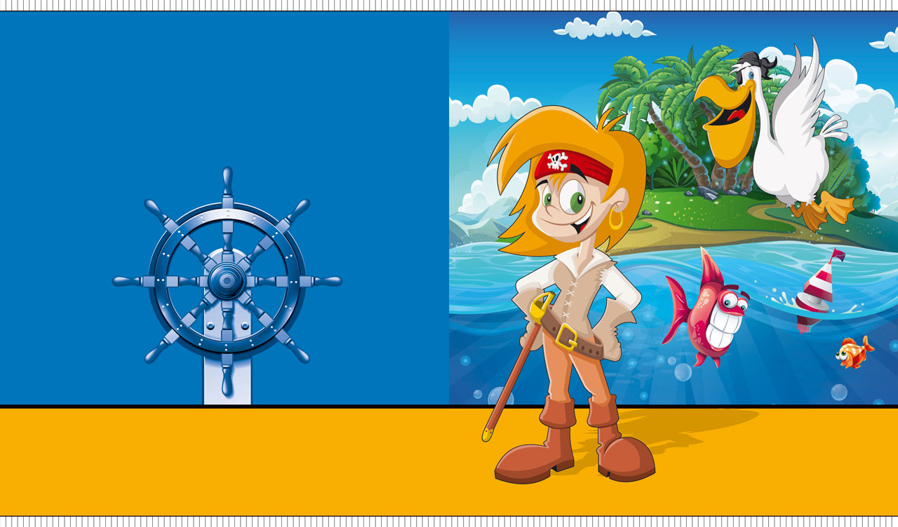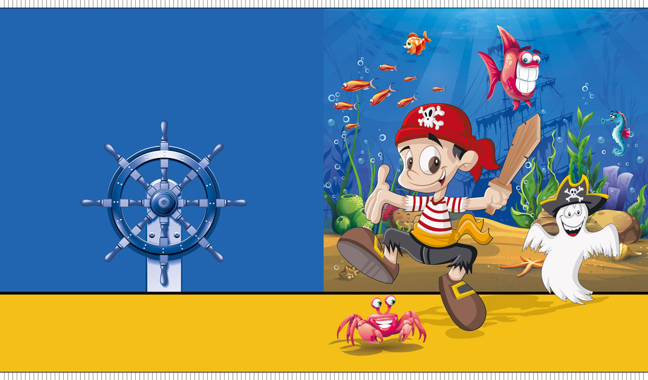 1. Funny pirate dances with a ghost underwater on a blue and yellow background 2. Female pirate and a funny octopus underwater on a blue and green background 3. Funny pirate with a pelican by an island on a blue and ocher backdrop 4. Funny pirate with an octopus underwater on a blue and purple background 5. Funny pirate with a parrot on a treasure chest on a blue and lime backdrop