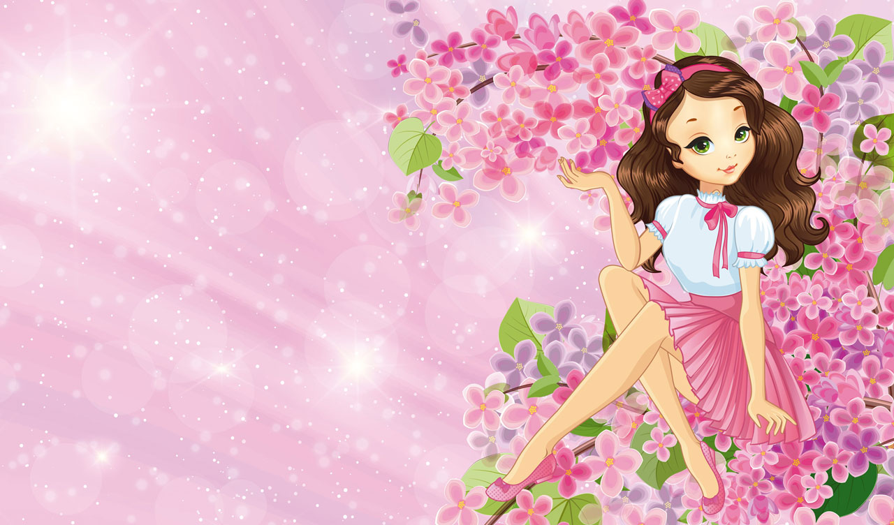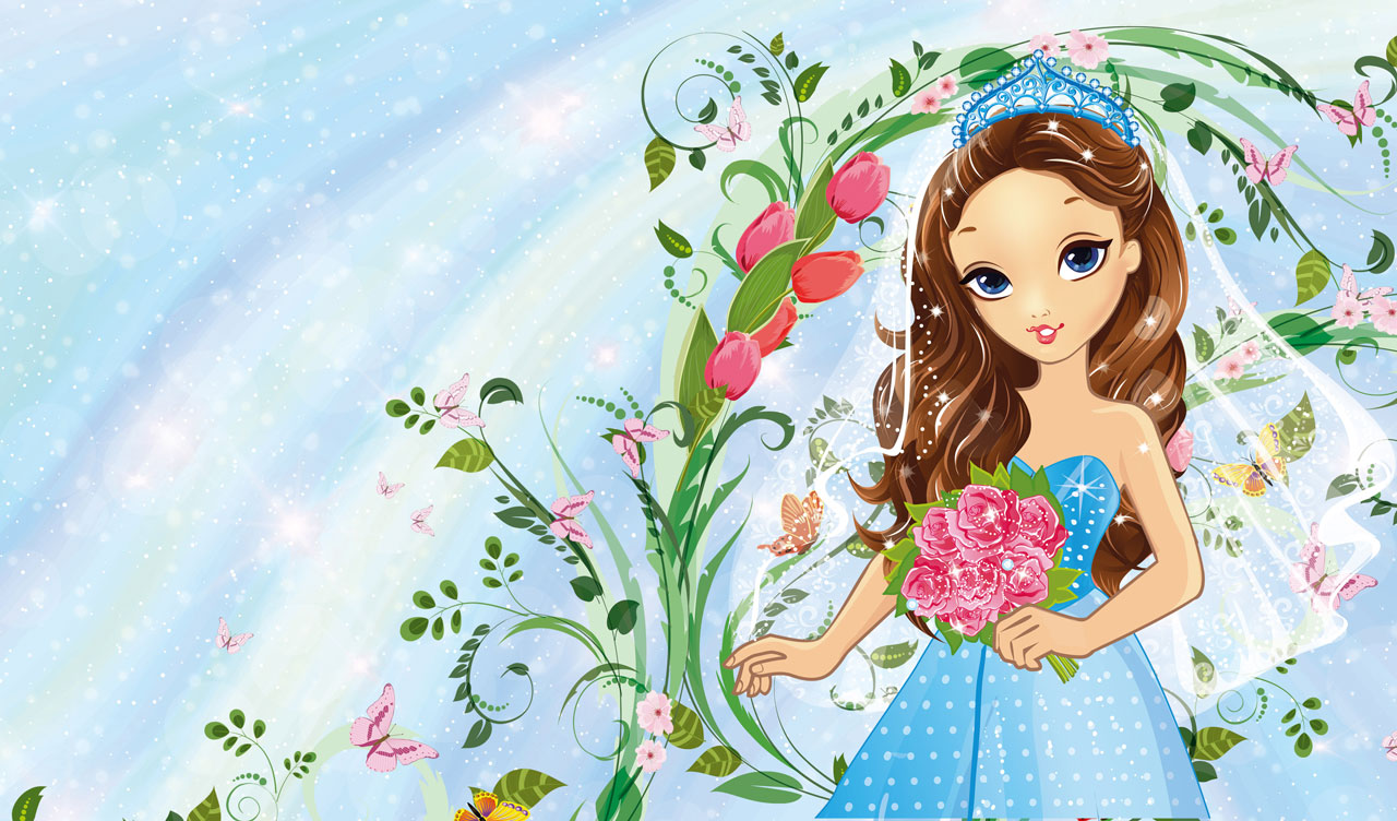 1. A dark blonde in a denim dress on a pastel purple backdrop with myriad stars 2. A brown-haired girl with a tiara on a pastel blue backdrop with myriad stars 3. A brown-haired girl in a white blouse on pastel pink backdrop with myriad stars 4. A blonde in a light blue dress on a pastel violet backdrop with myriad stars 5. A light blonde in a purple dress on a pastel purple backdrop with myriad stars
