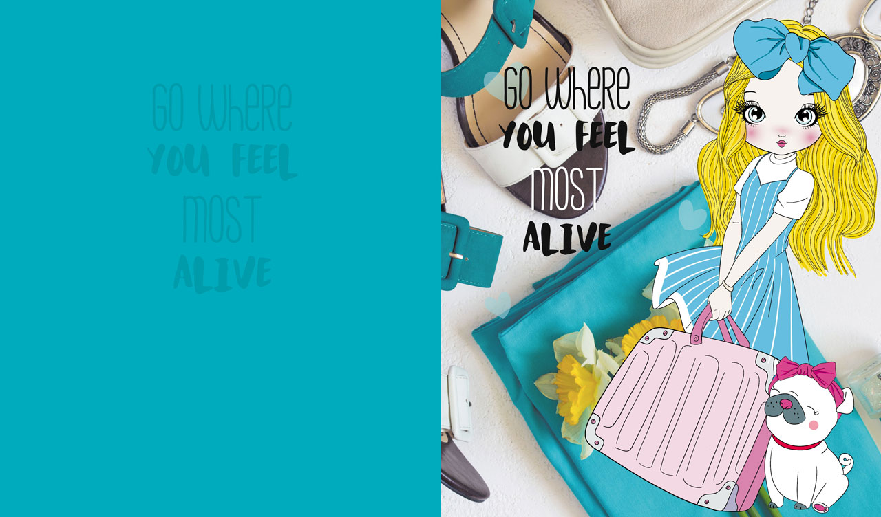 2. Animated blonde girl with a cute dog ready to travel on a teal backdrop