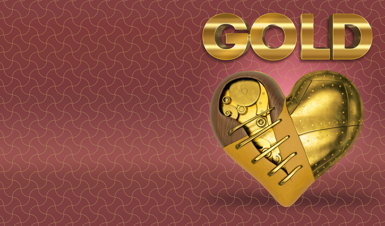 A gold steampunk heart isolated on abstract golden chinese style seamless pattern on a brown-red background.