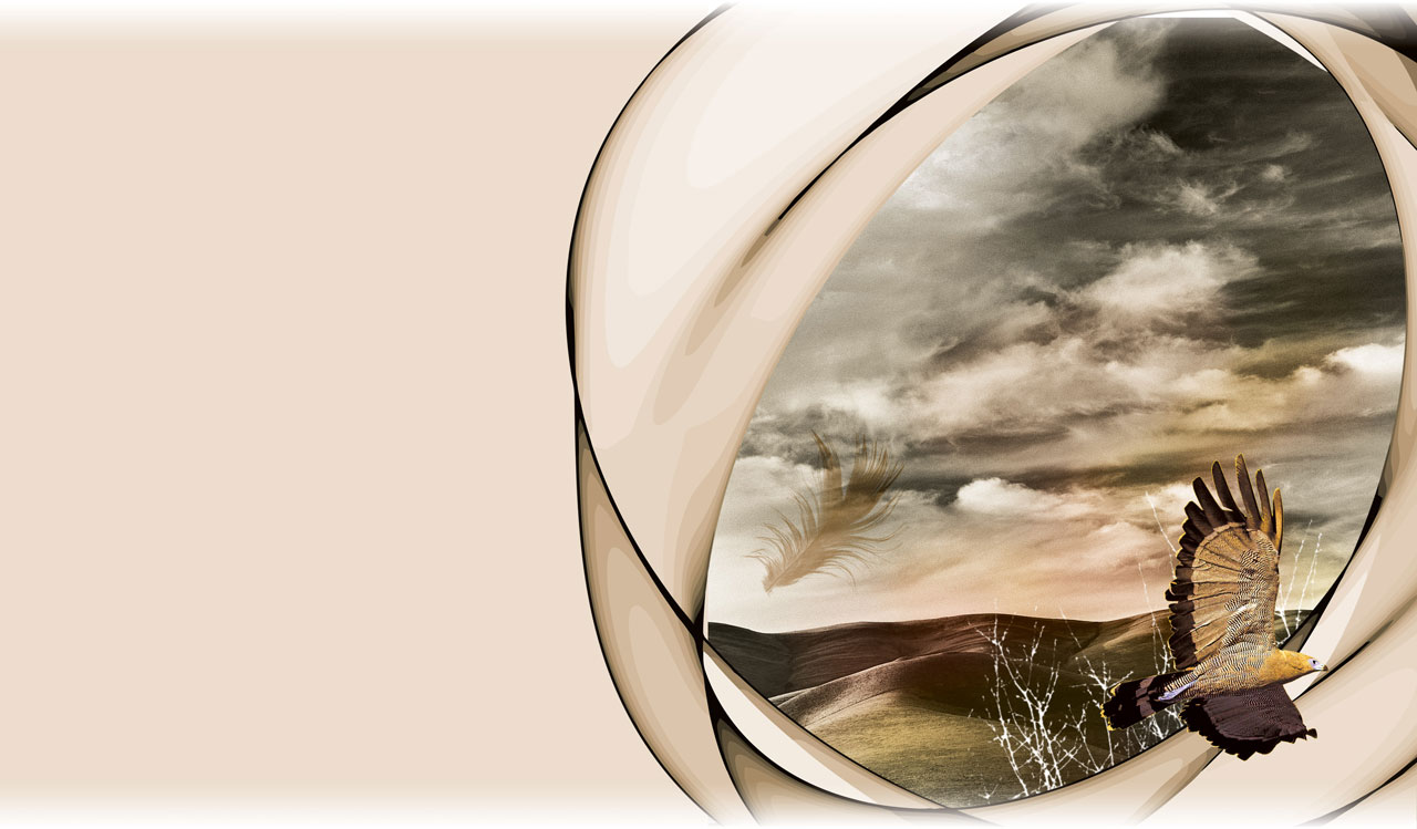 Golden eagle flying on gray brown sky over dunes, with feather and bush stencil below on a pastel beige background.