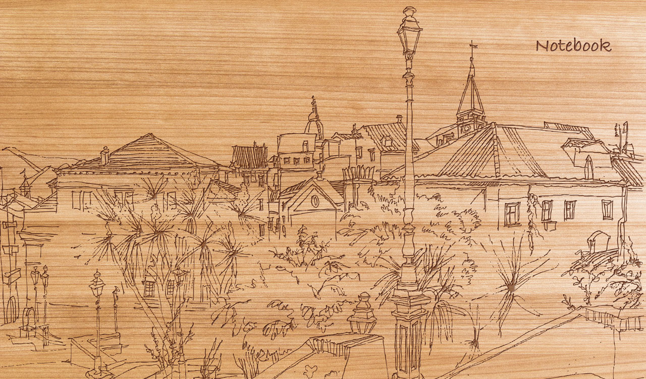 2. Wood burning art depicting a town sketch on a wooden backdrop