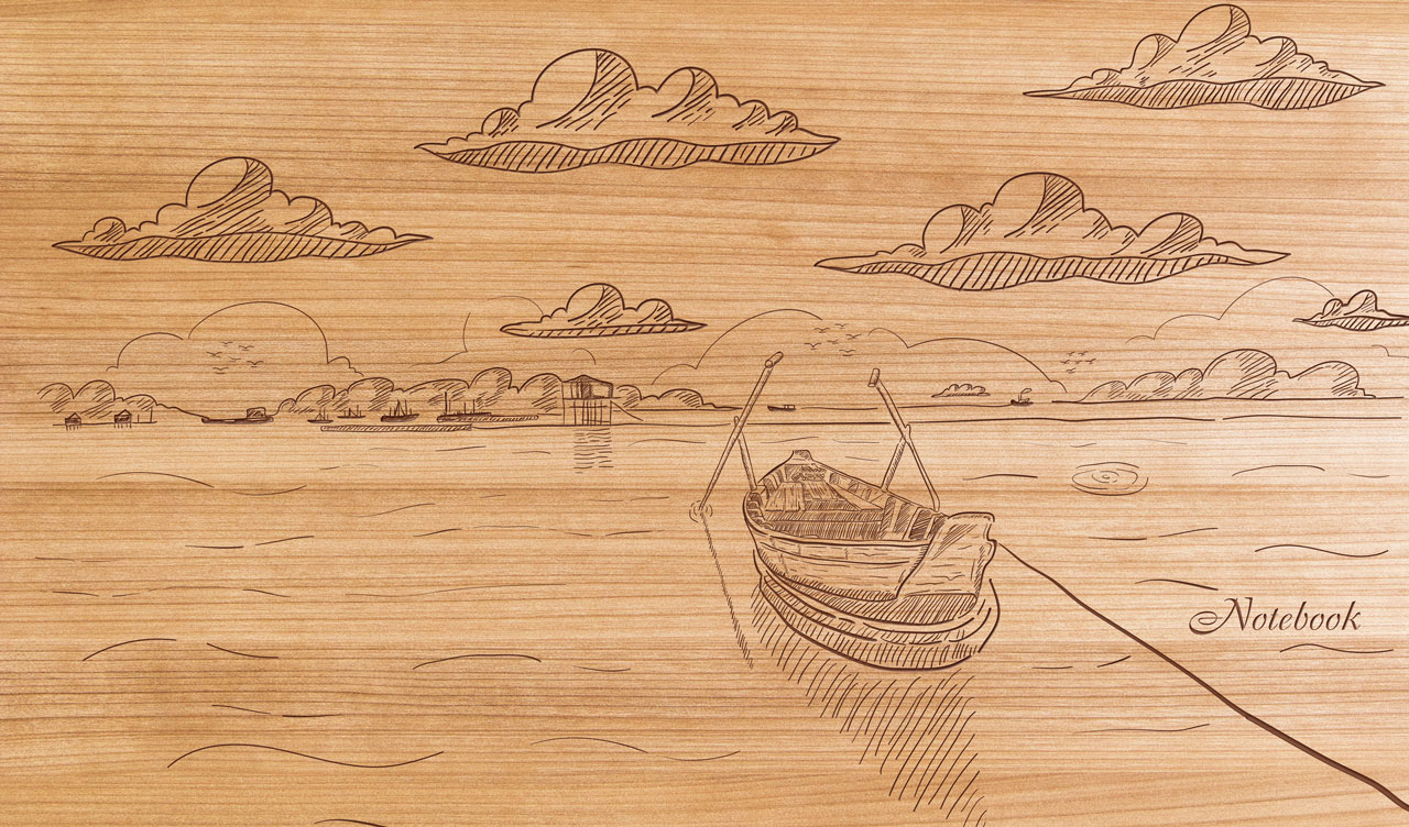 Wood burning art depicting a boat on a lake on a beige wooden texture