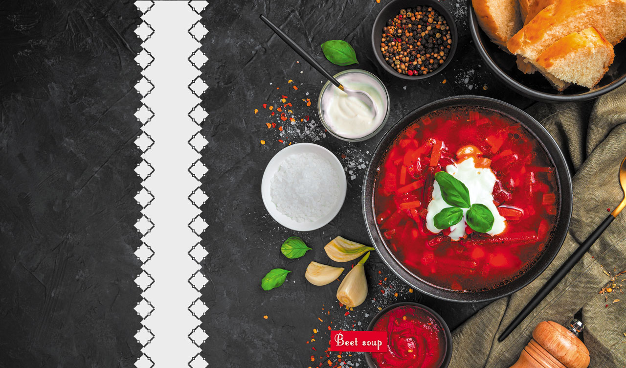 2. Beet soup with sour cream and fresh basil on a black textured backdrop