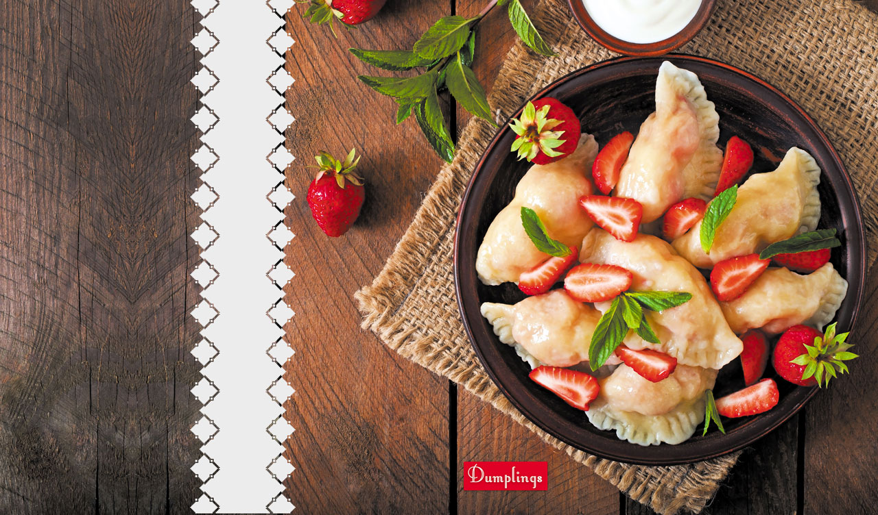 3. Delicious dumplings with fresh strawberries and mint on a wood-textured backdrop