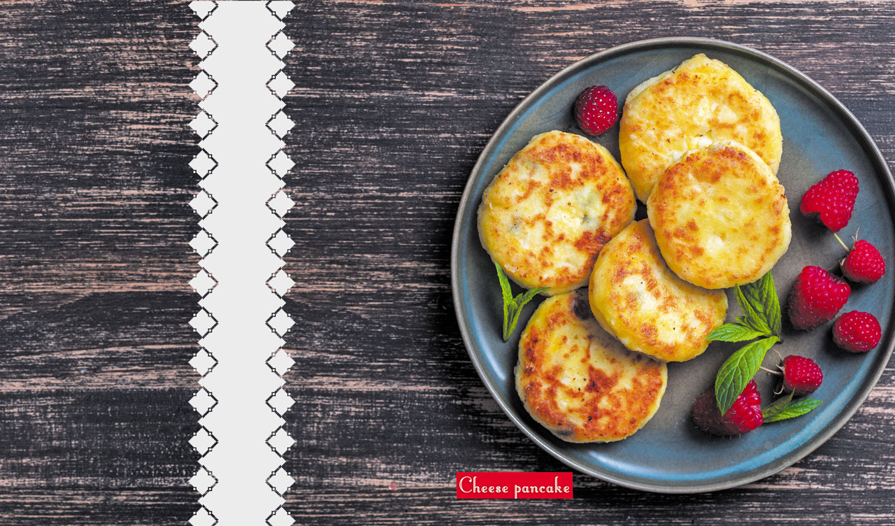4. Cheese pancakes with raspberries and mint on a dark wooden-textured backdrop