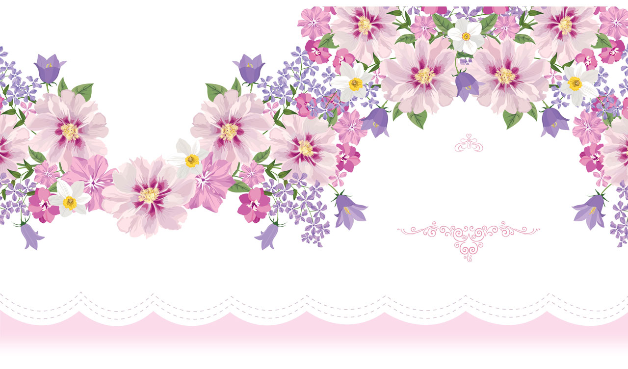 1. Pastel pink flower bouquet on a white backdrop with decorative border 2. Seamless pattern of mallows, bluebells cosmos flowers on a white backdrop 3. Floral composition of mallows, bluebells cosmos flowers on pastel pink backdrop 4. Pastel pink and purple floral arch on a white backdrop with decorative border