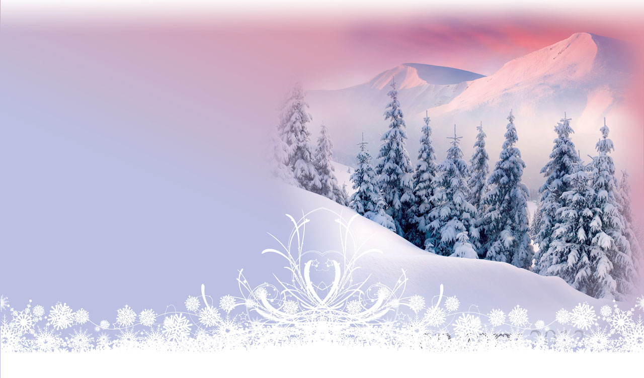 3. Snowy tress against the backdrop of mountains at dawn on a purple-grey gradient