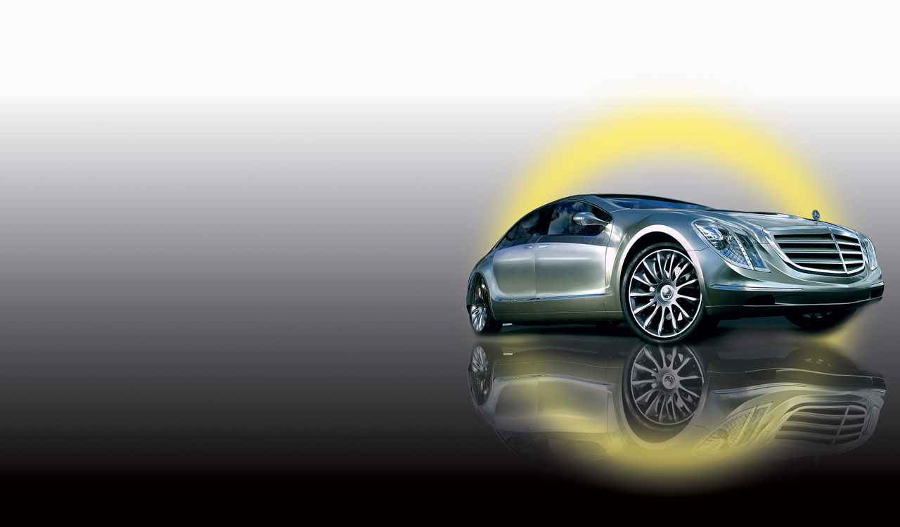Grey luxury business class sedan with its reflection below, enclosed in a yellow glowing circle on grey gradient background.