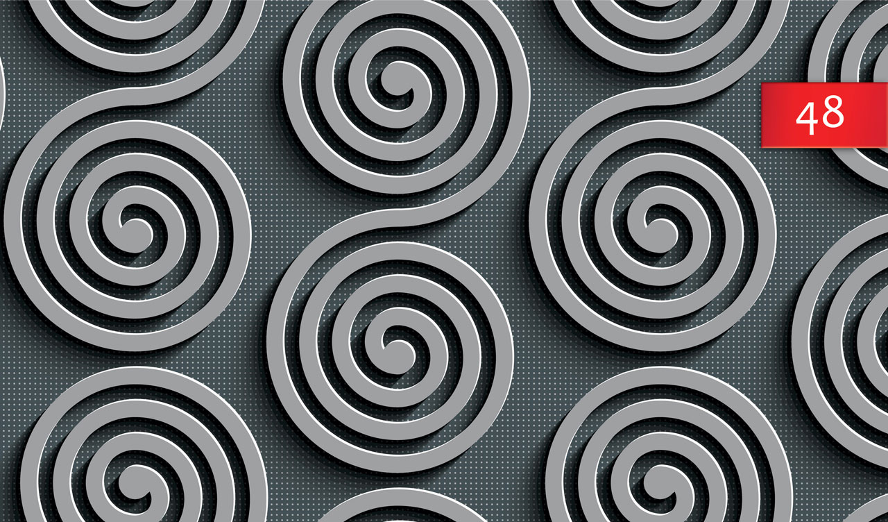 Grey abstraction of S shape spiral patterns on a metallic grey background of seamless small polka dot pattern.