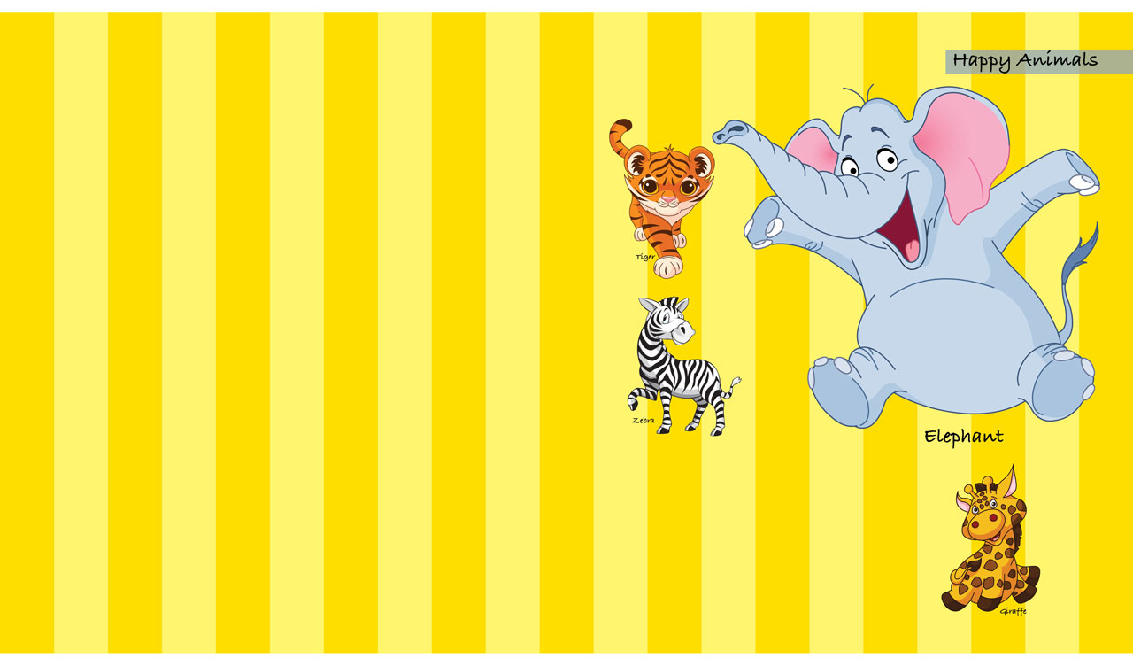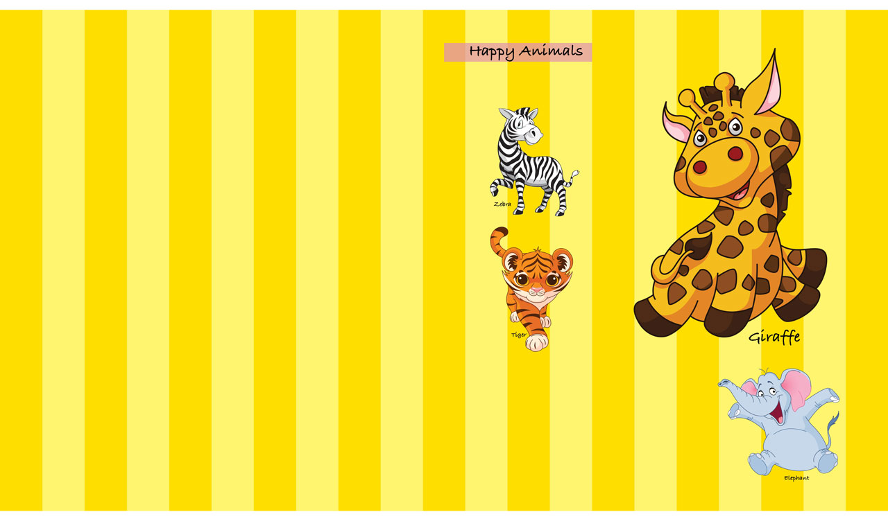 1. Happy cartoon tiger and its friends on a yellow striped backdrop 2. Happy cartoon elephant and its friends on a yellow striped backdrop 3. Happy cartoon giraffe and its friends on a yellow striped backdrop 4. Happy cartoon zebra and its friends on a yellow striped backdrop