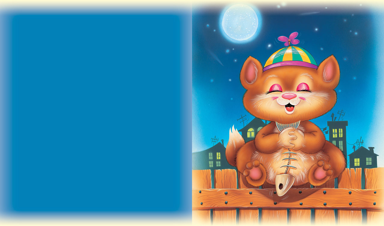 3. Animated happy kitten with fish skeleton on a blue background