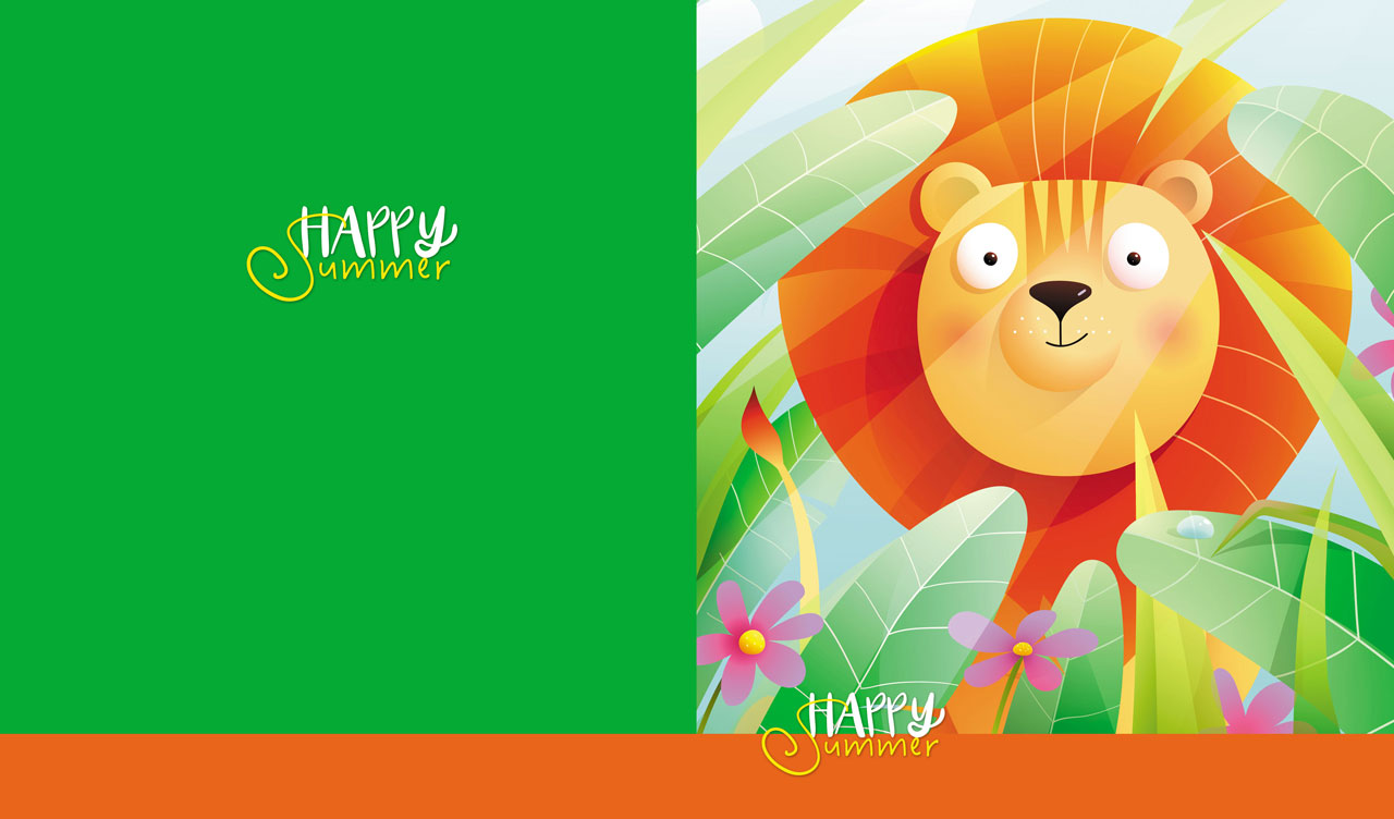 1. Illustration of a happy summer elephant in a green tropical jungle