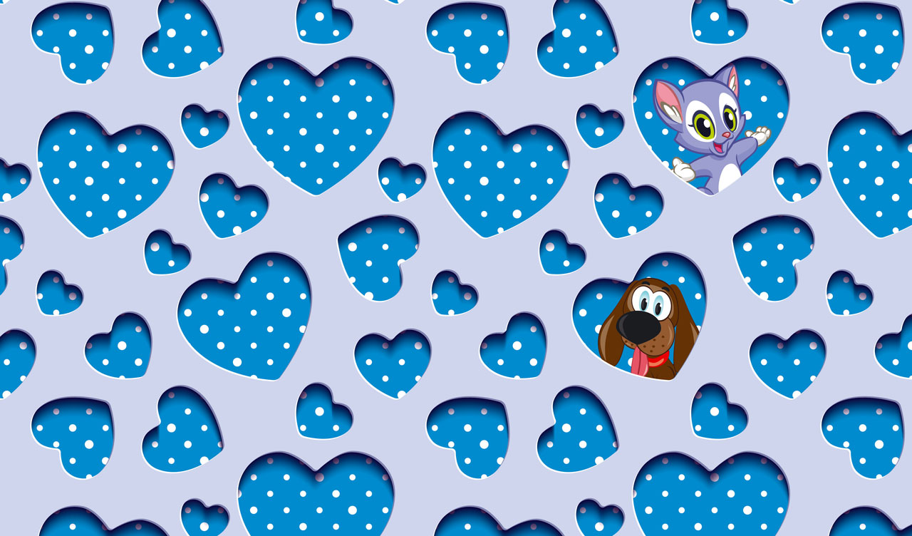 1. Cat and dog on pastel navy seamless heart pattern and blue polka dot backdrop