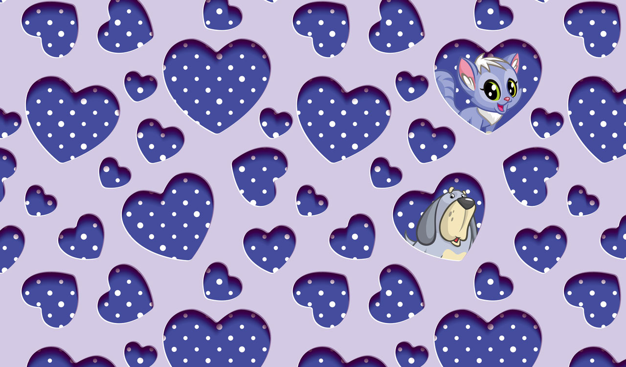 3. Cat and dog on violet seamless heart pattern and purple polka dot backdrop