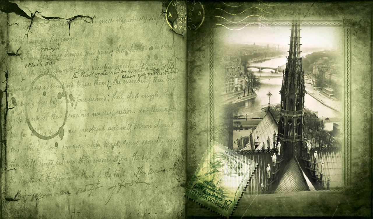 1. Vintage photo of Notre Dame on the green sepia pages of an old photo album