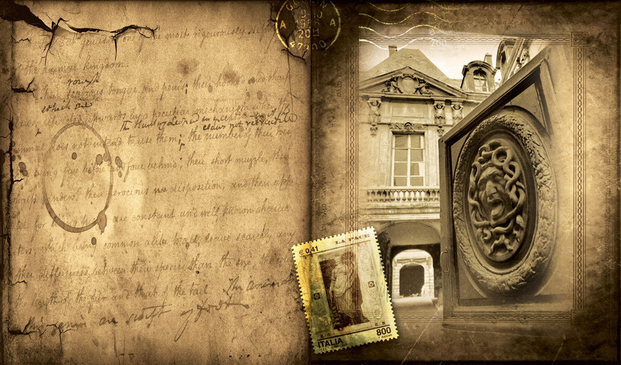 3. The head of Medusa carving in Paris vintage photo in a tan sepia old photo album