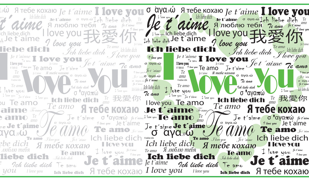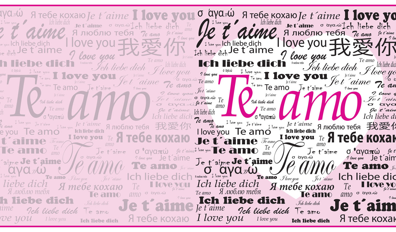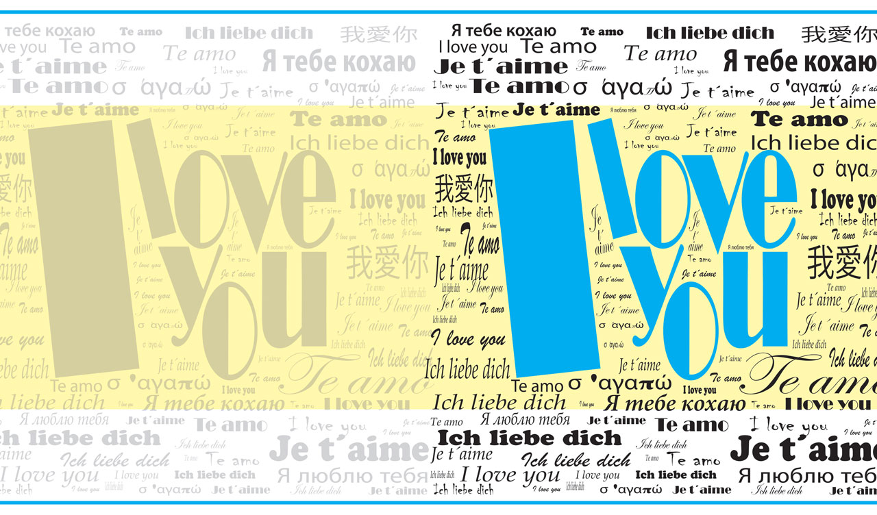 1. I Love You in many languages on pastel yellow and white newspaper style poster 2. Je taime in many languages on black and white newspaper style poster 3. I Love You in many languages on a white newspaper style poster 4. Te Amo in many languages on pastel pink newspaper style poster