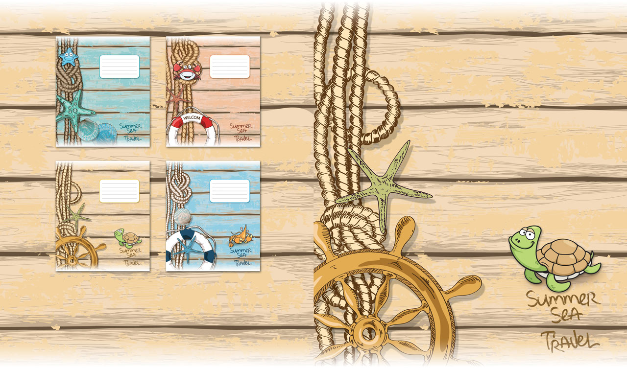 Summer sea travel theme picture of starfish and helm on a rope and a cartoon sea turtle against a beige weathered boardwalk.