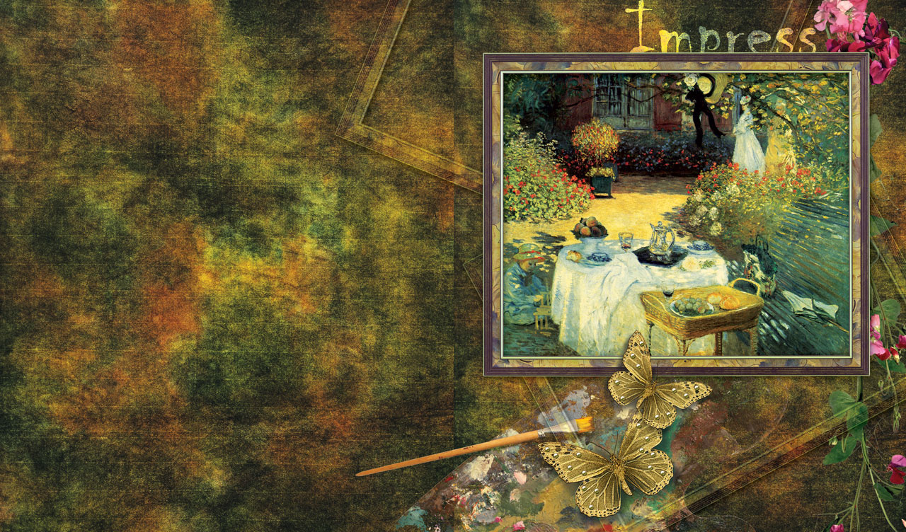 Impressionist painting by Claude Monet named The Lunch on a textured blurred green red background, with butterflies and a brush below.