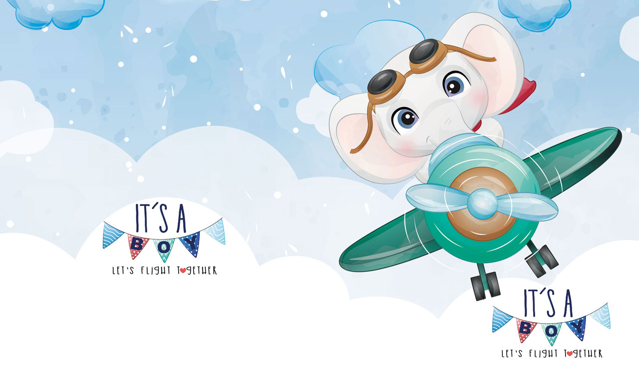 1. Cute cartoon elephant piloting a plane against pastel blue and white cloudy sky