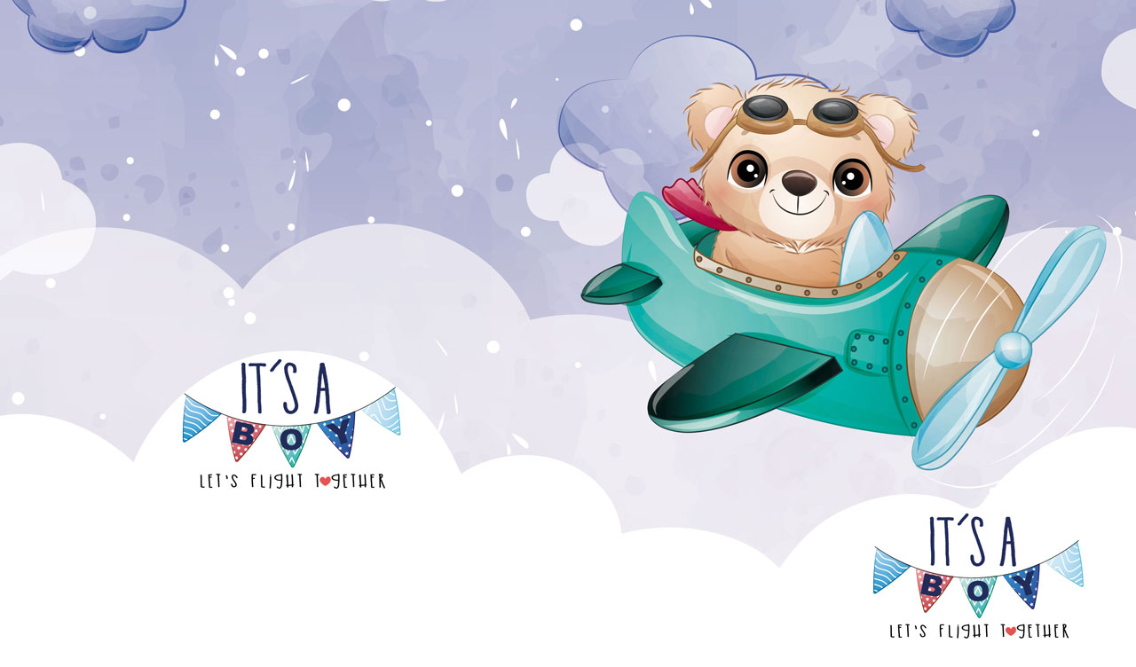 4. Cute cartoon bear piloting a plane against pastel violet and white cloudy sky