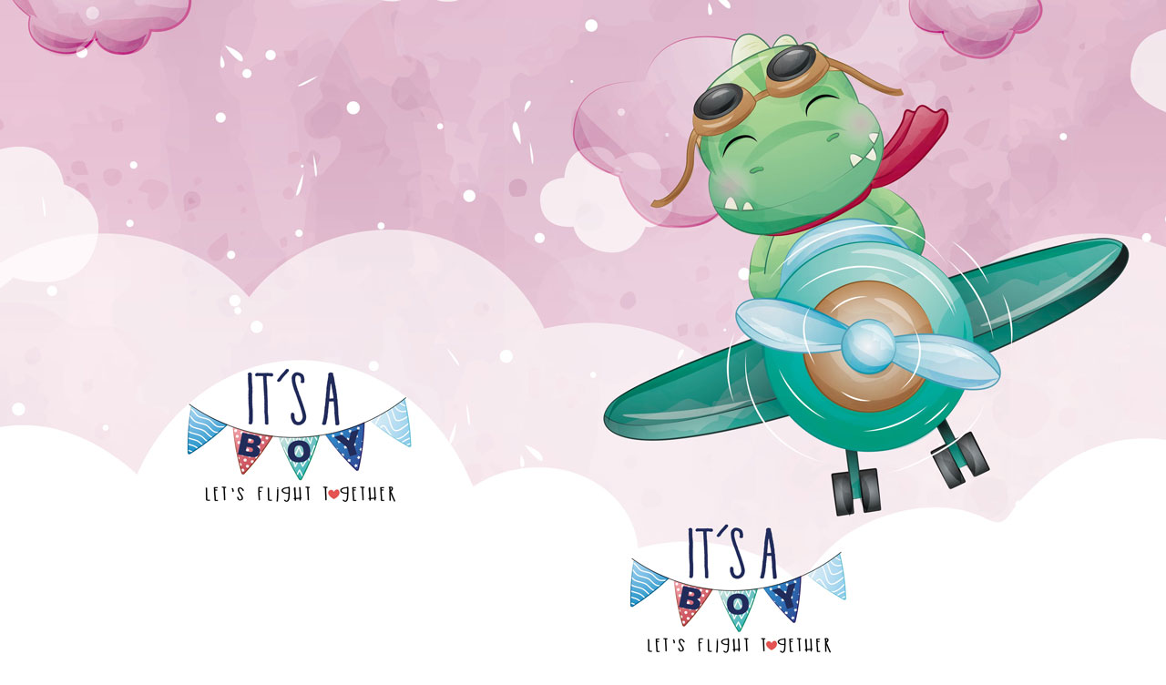 5. Cute cartoon dino piloting a plane against pastel pink and white cloudy sky