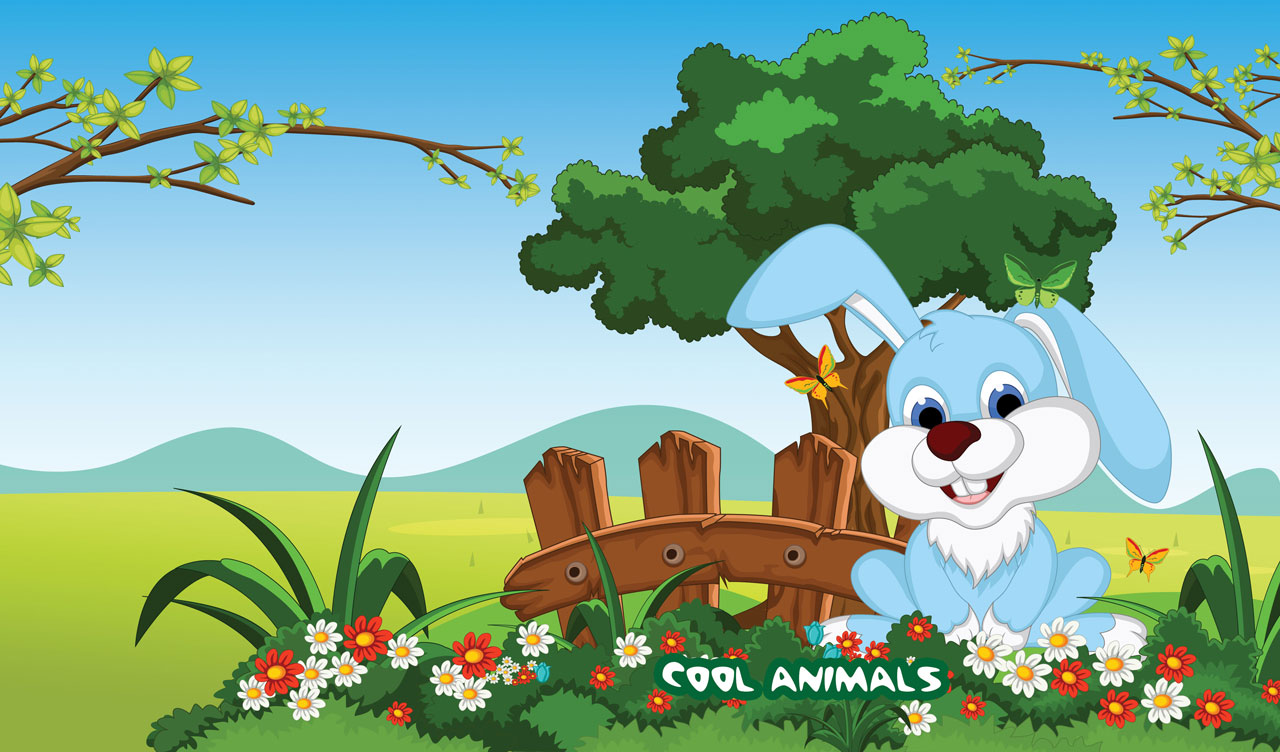 1. Happy pink cartoon hippo in the green jungle on a blue sunny day 2. Happy grey cartoon rhino in the green jungle on a blue sunny day 3. Happy light blue cartoon bunny by the garden fence on a blue sunny day 4. Happy brown cartoon horse in the green forest on a blue sunny day 5. Happy black and tan cartoon monkey in the green jungle on a blue sunny day