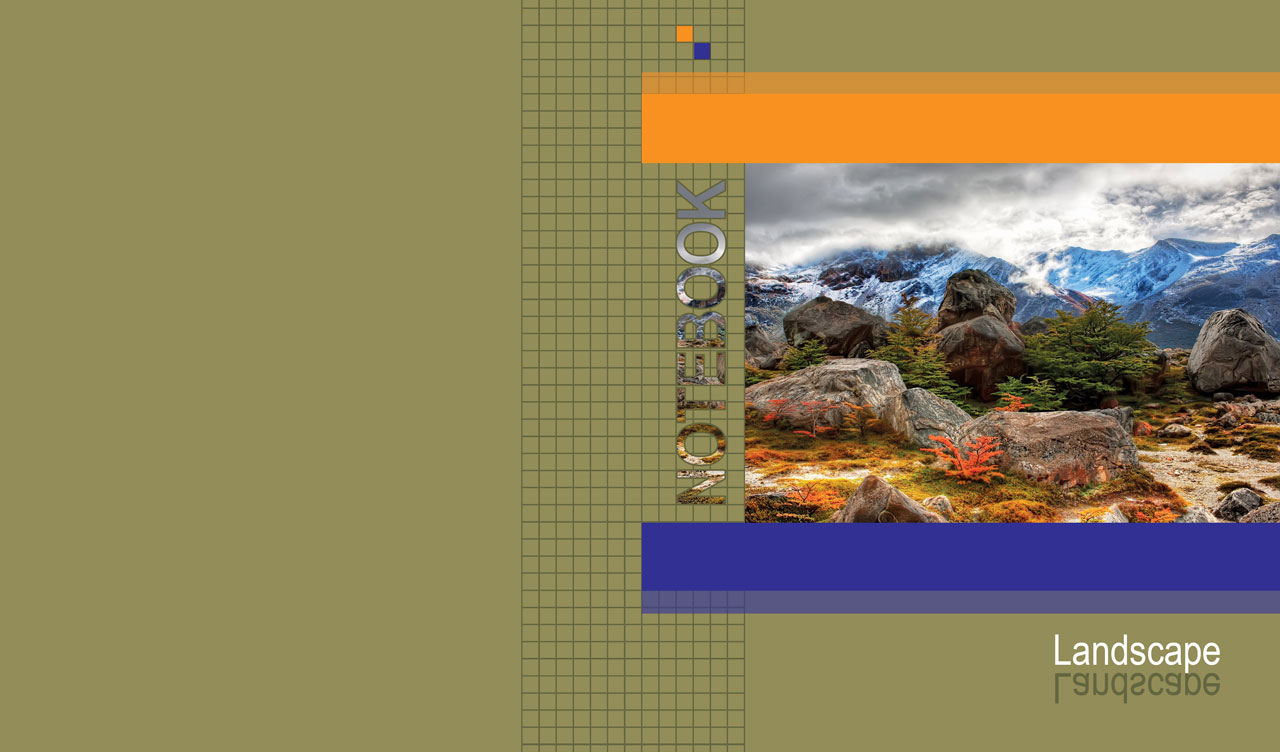 1. Poppy field landscape at sunset on khaki green backdrop 2. Green field landscape with tree at sunset with khaki green background 3. Boulders against a mountain range in a shroud of clouds against a khaki backdrop 4. Rocky mountain stream surrounded by a red-bush rocks against a khaki backdrop