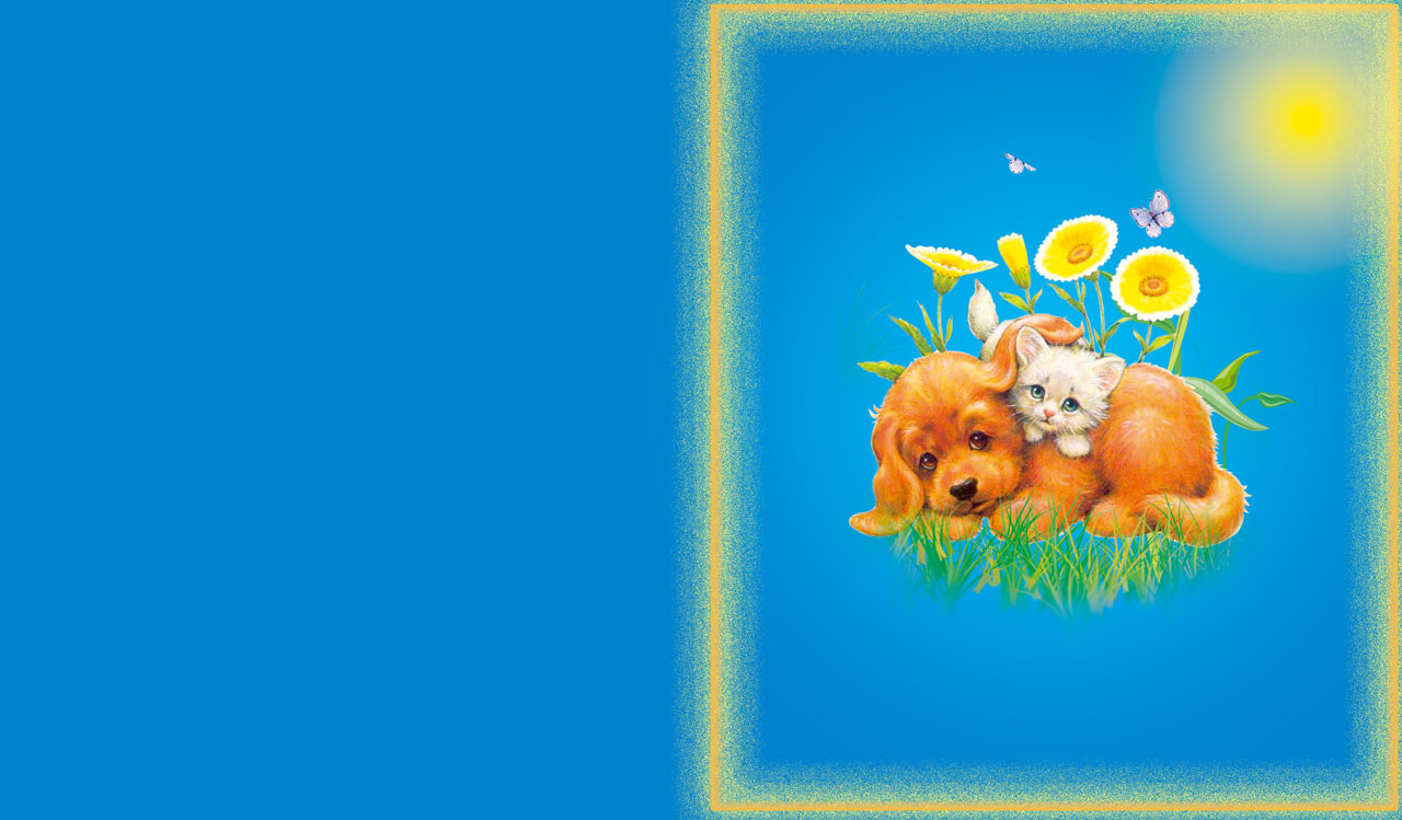 Illustration of a white kitten sleeping on the a brown puppy in a garden of green grass and yellow flowers, on the blue background of a sunny day.