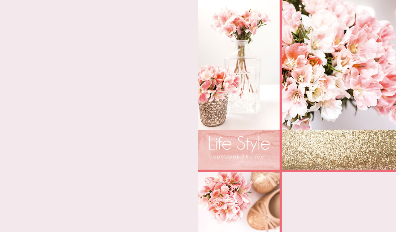 1. A lifestyle collage of old architecture, cookies and coffee in bed on pale pink 2. A lifestyle collage of white-pink Satin flowers and ballerina flats on pale pink 3. A lifestyle collage of macaroons, headphones, pens and roses on pale pink 4. A lifestyle collage of an old building, keyboard, coffee and cotton on pale pink 5. A lifestyle collage of a pinkish mug, golden paperclips, and roses on pale pink