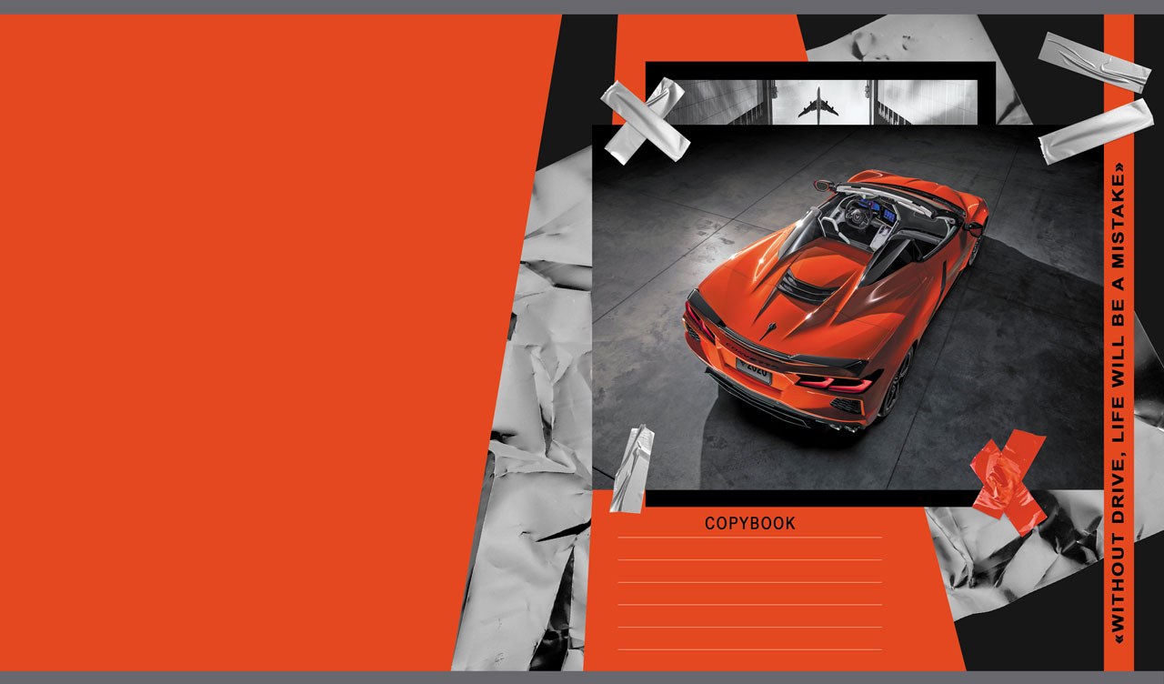 2. Bright orange sports car image on foil layout against a fire orange backdrop