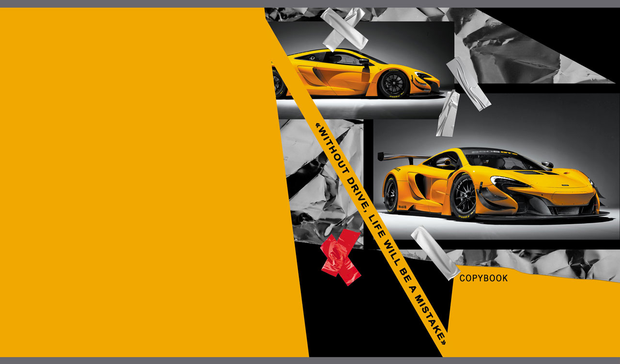 4. Yellow sports car images on foil layout against a dark yellow backdrop