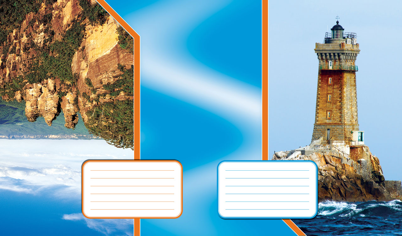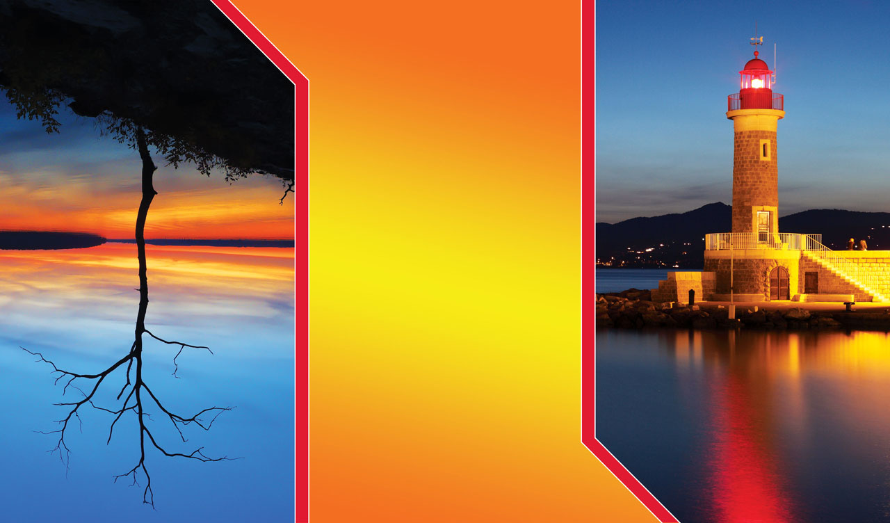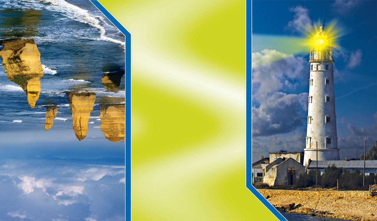 1. White and red lighthouse shines from a high against the blue sky in full moon 2. Yellow lighthouse in the sea against the mountains and the blue evening sky 3. White lighthouse shines with a yellow light against the blue evening sky 4. Brick tower lighthouse on a rock in the dark blue sea against the light blue sky